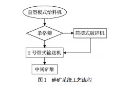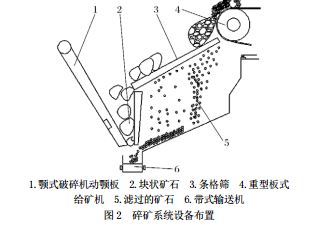該礦碎礦系統(tǒng)工藝流程如圖1所示,設備布置如圖2所示,來料首先通過條格篩進行篩選。