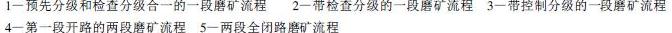 常規(guī)磨礦工藝包括棒磨和球磨,所使用的常規(guī)磨礦流程主要有:?jiǎn)我话裟?、棒?球磨、單一球磨共3種。常用的磨礦工藝流程主要有以下5種結(jié)構(gòu),見下圖。